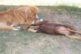 Nova and Belle have been playing together a bit, Nova will lay on his back and she will leap at him it is very funny too watch considering the size difference. She has begun to follow him around to his dismay, seeing as she keeps licking his mouth and rolling over in front of him haha.